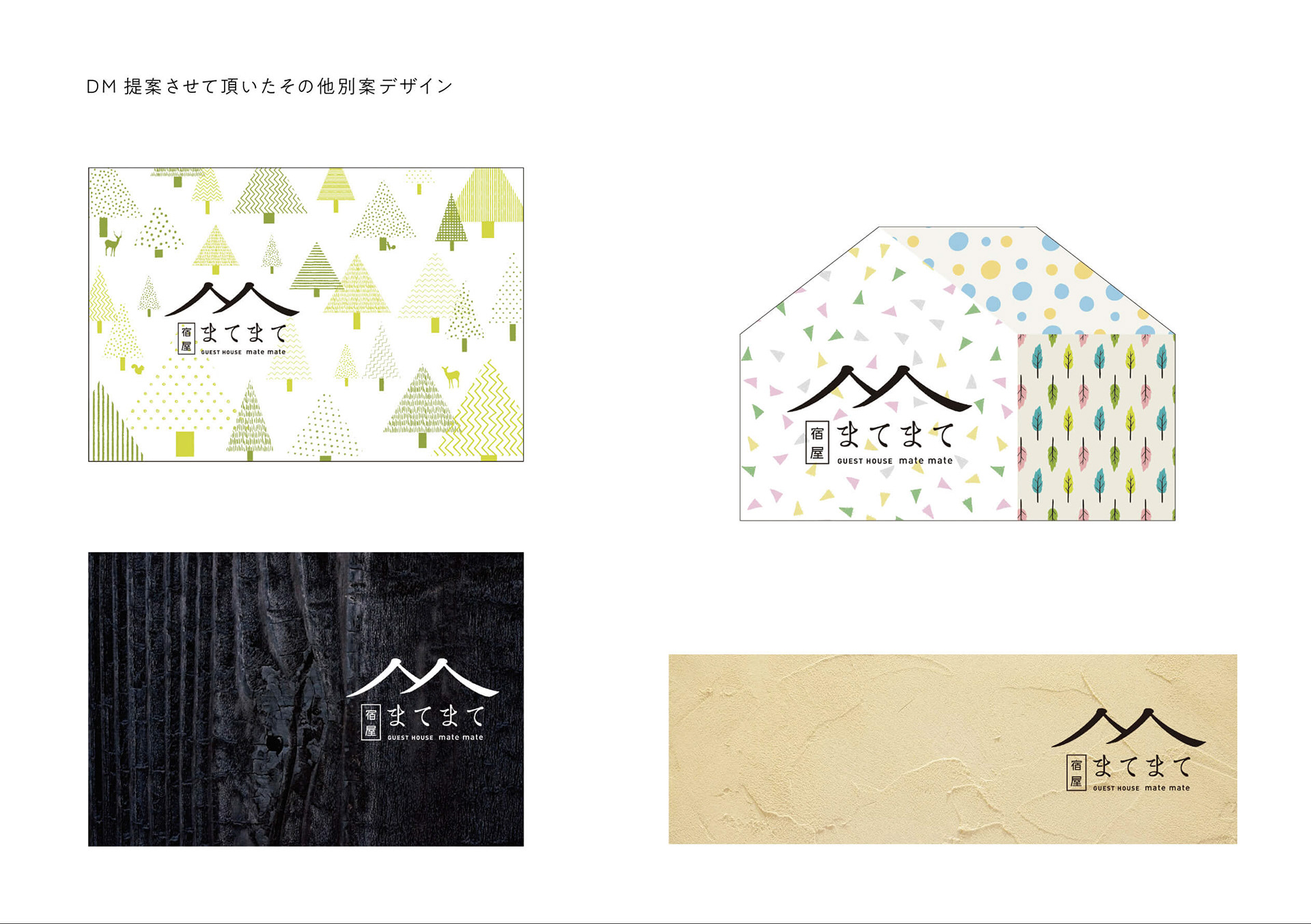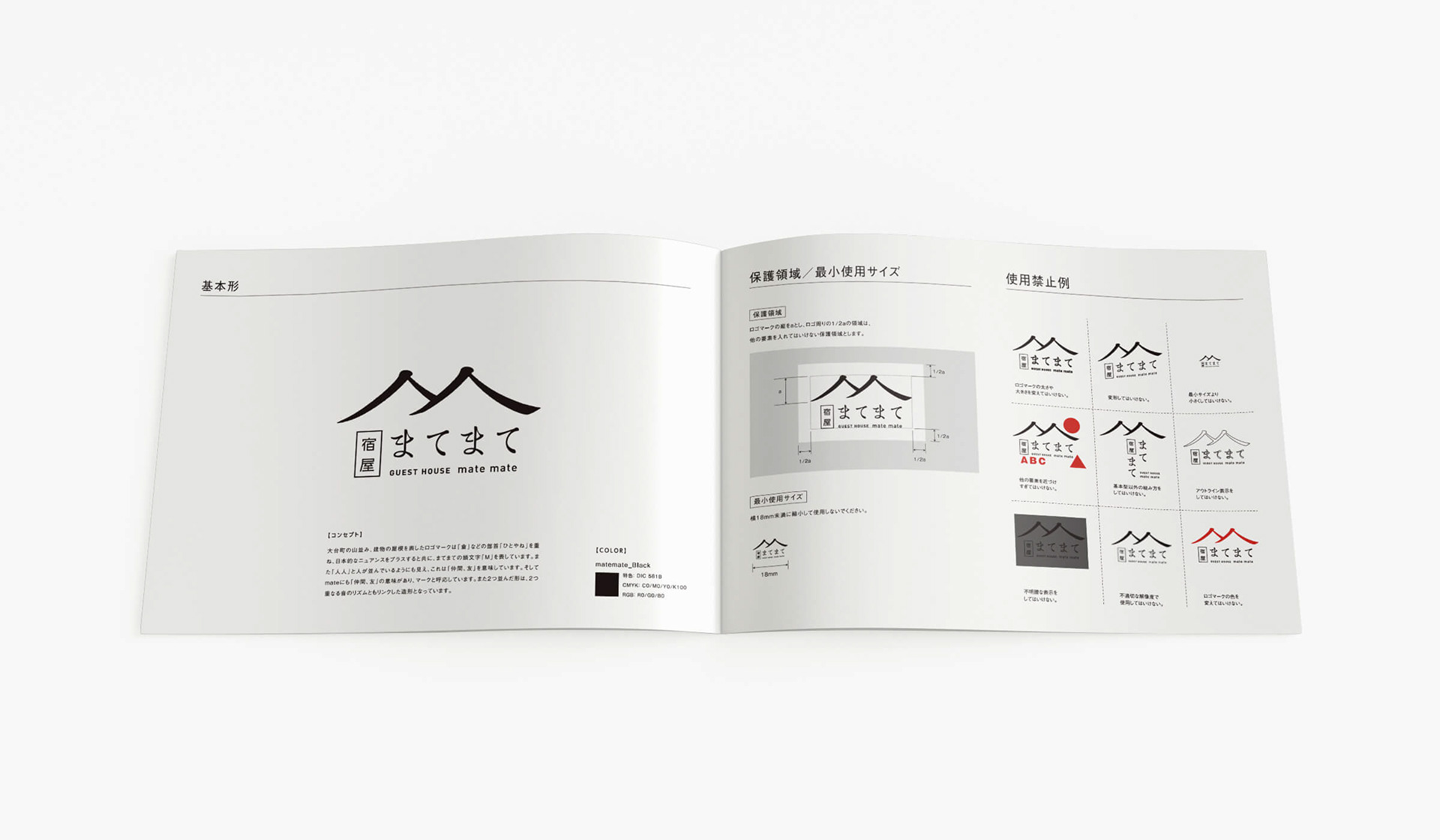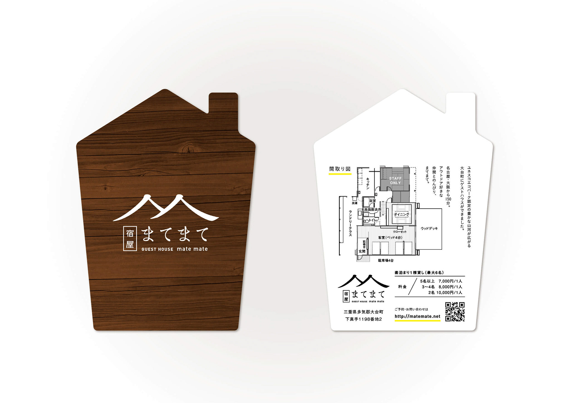 三重県大台町のゲストハウス「宿屋まてまて」のロゴやDMを制作させていただきました。人のつながりを大切に、という思いを込め漢字の「人」が繫がったシンボルマーク。これは「宿屋の屋根」「山・自然」「アルファベットの頭文字M」も表しています。また、まてまてと2度繰り返すリズミカルな調子ともリンクした造形になっています。DMは家の形に型抜きをしました。
