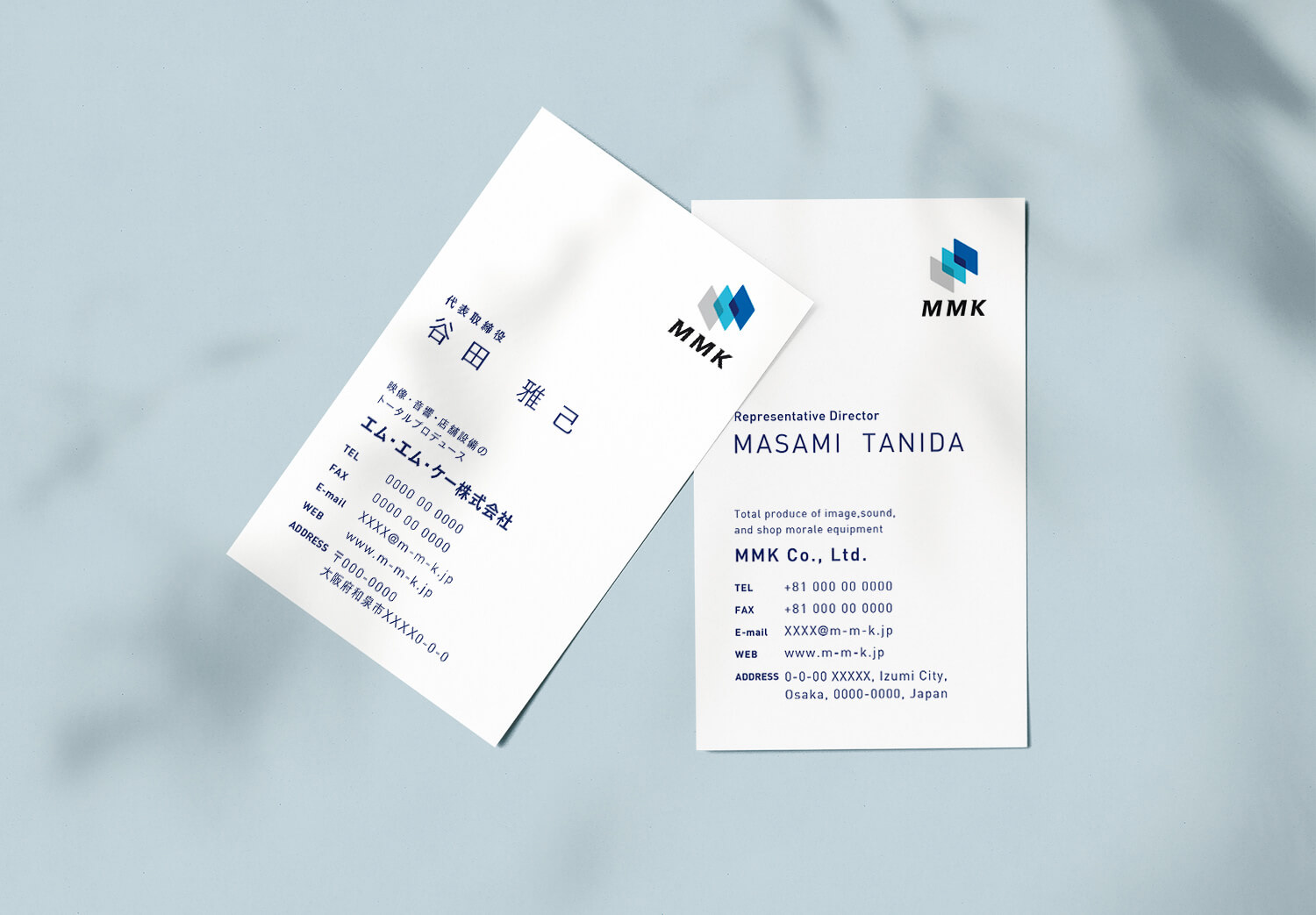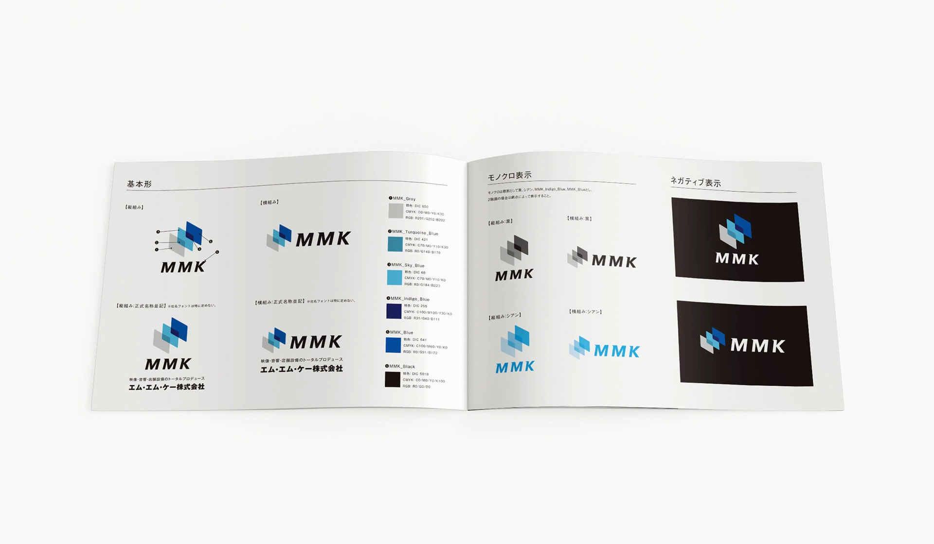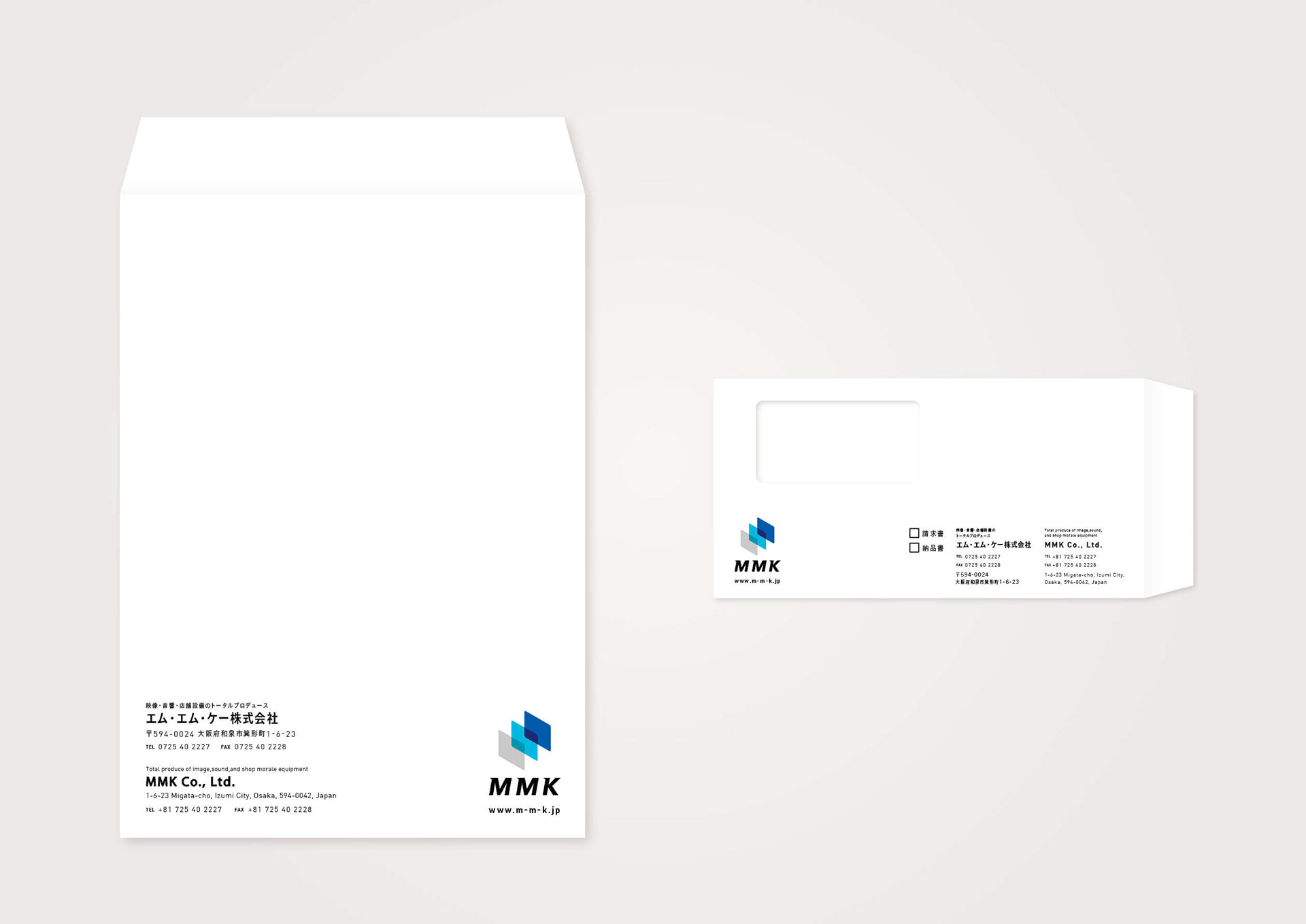 MMK株式会社様のロゴ・封筒・名刺など制作させていただきました。ロゴのシンボルマークは社名3つの頭文字を意味し、取扱い商品である液晶パネルなどを連想するような造形で成長と繋がりを表現。頭文字のMもこっそり隠れています。